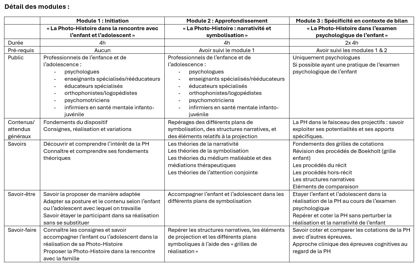 Le parcours se compose de trois modules indépendants mais complémentaires, chacun se déroulant sur une journée. Bien que chaque module soit progressif, le premier module permet à lui seul d’utiliser l’outil Photo-Histoire et d’en comprendre les fondements essentiels. Les modules suivants permettent d’approfondir la pratique, avec une exigence de participation préalable aux modules précédents.